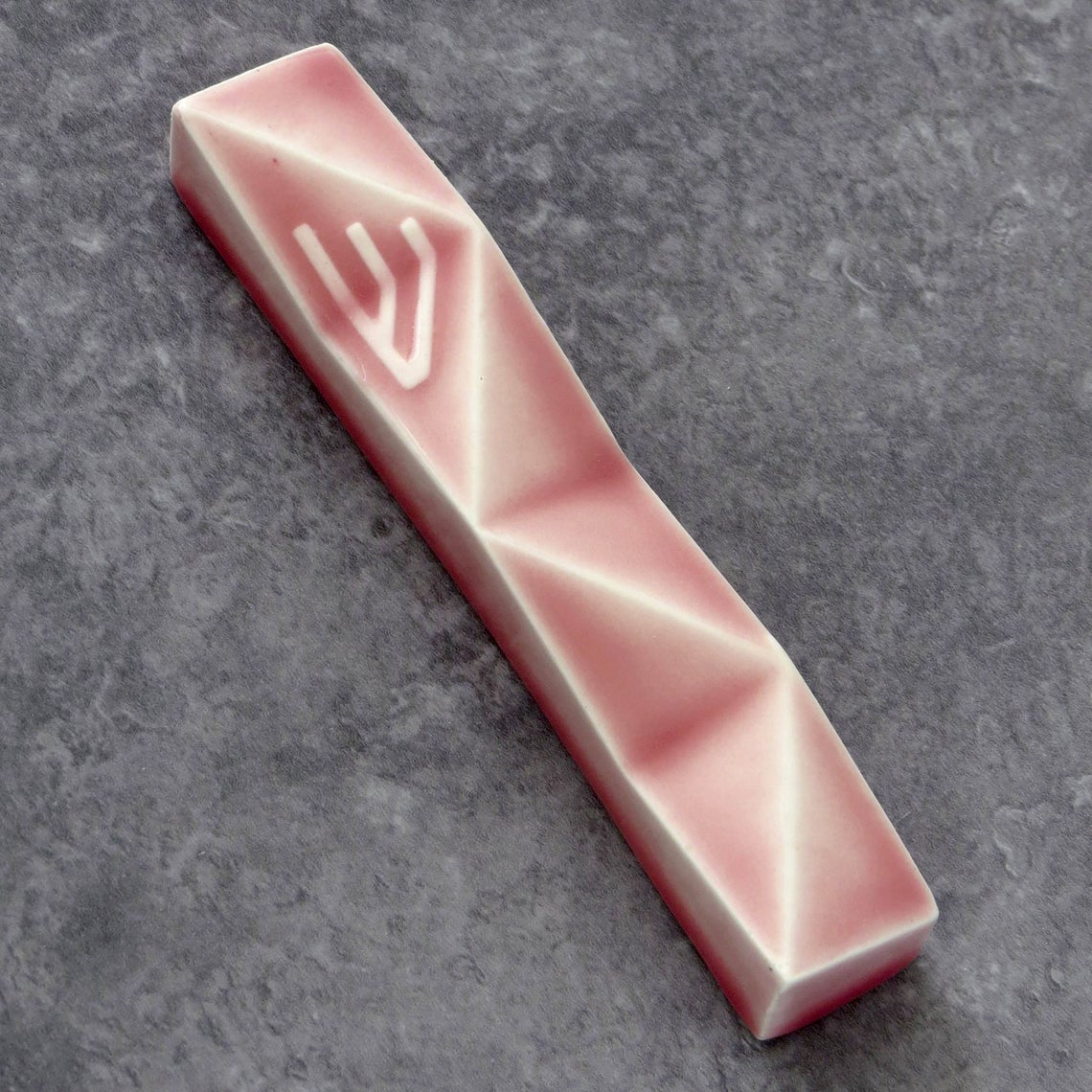 המזוזה מיוצרת מקרמיקה עם גלזורה ורודה בעבודת יד