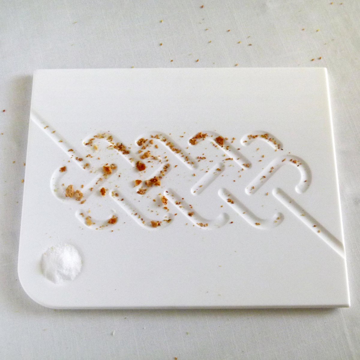 במשטח העמיד הייחודי לחומר הקוריאן מוטבעת דוגמאת חלה מינימליסטית ומתוחכמת, בה ניתן לאסוף את הפירורים הנותרים לאחר חיתוך החלה בצורה שמדגישה את הדוגמא ומוסיפה משחקיות לקישוט שולחן השבת.