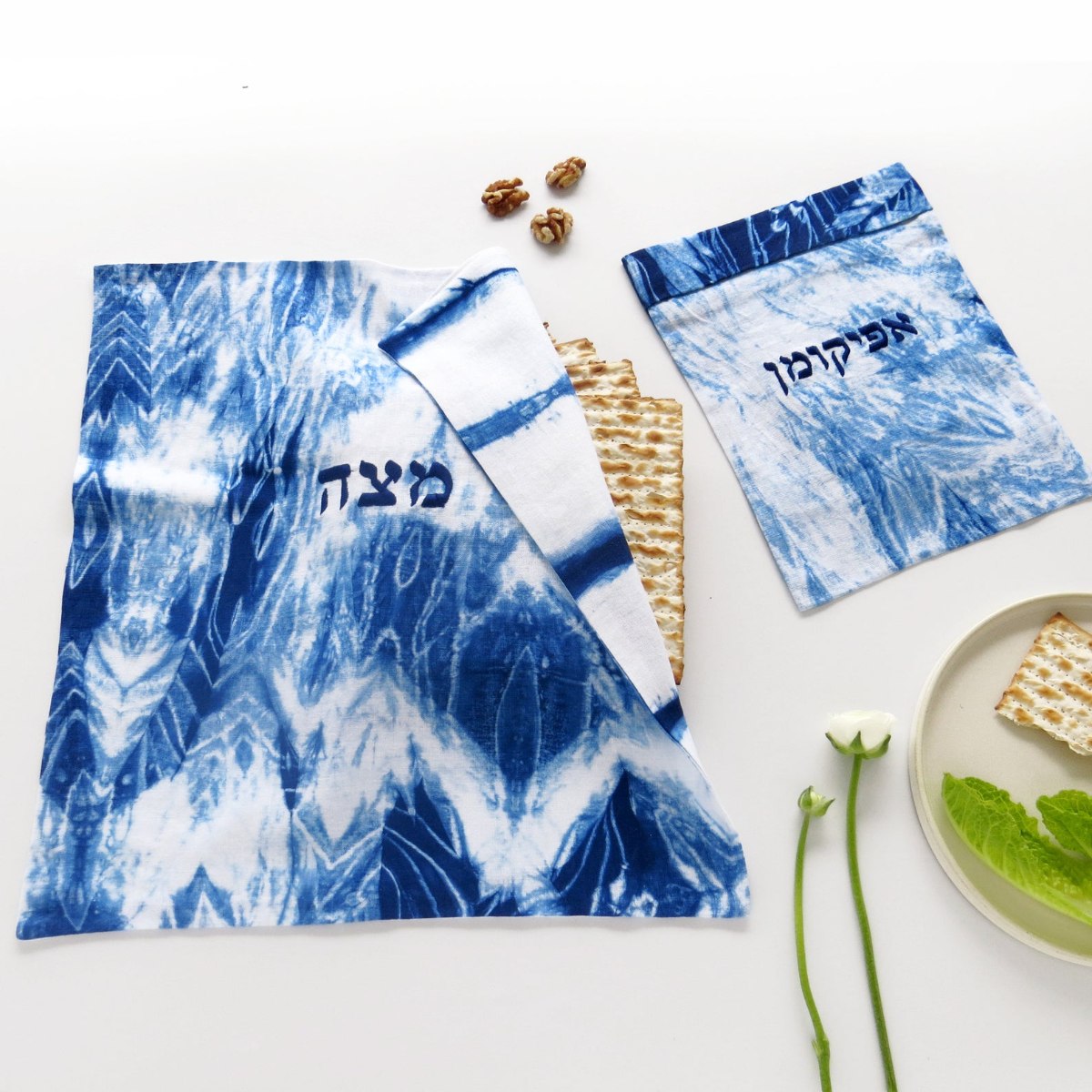סט של כיסוי למצה ולאפיקומן בצביעת שיבורי ידנית ורקמה- כל סט יחיד ומיוחד!