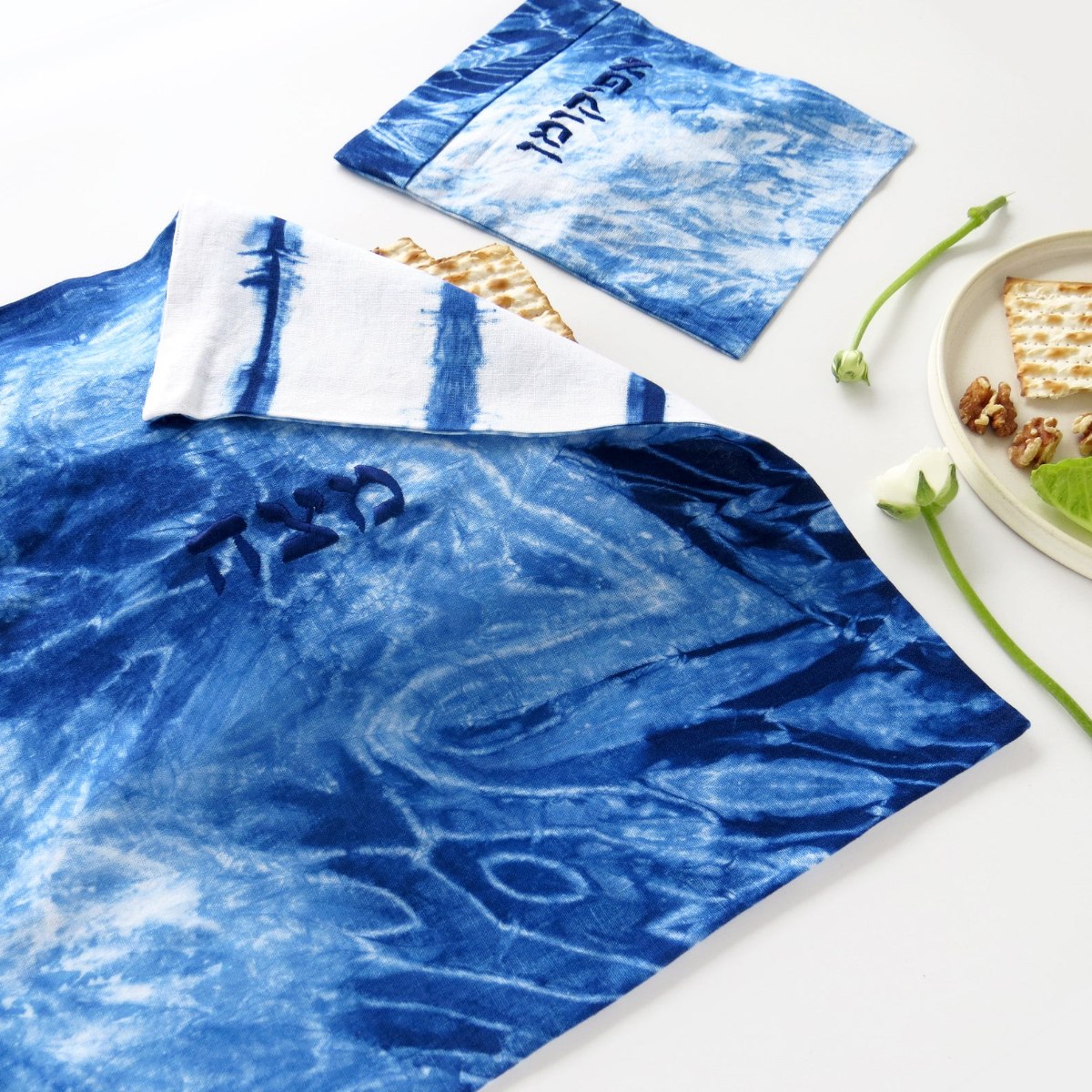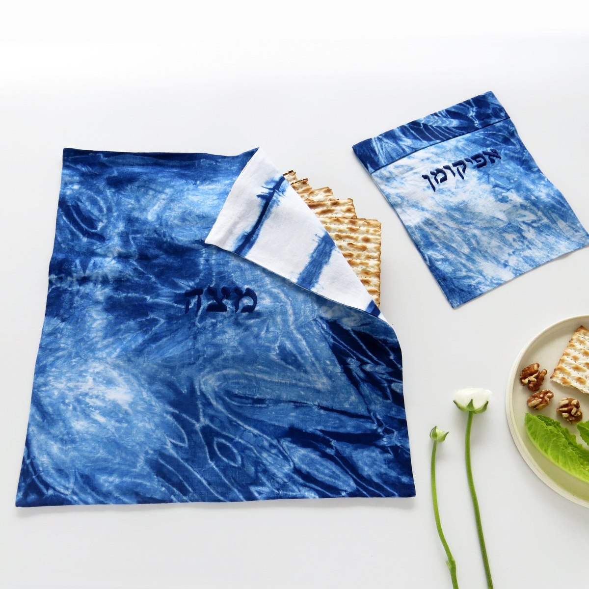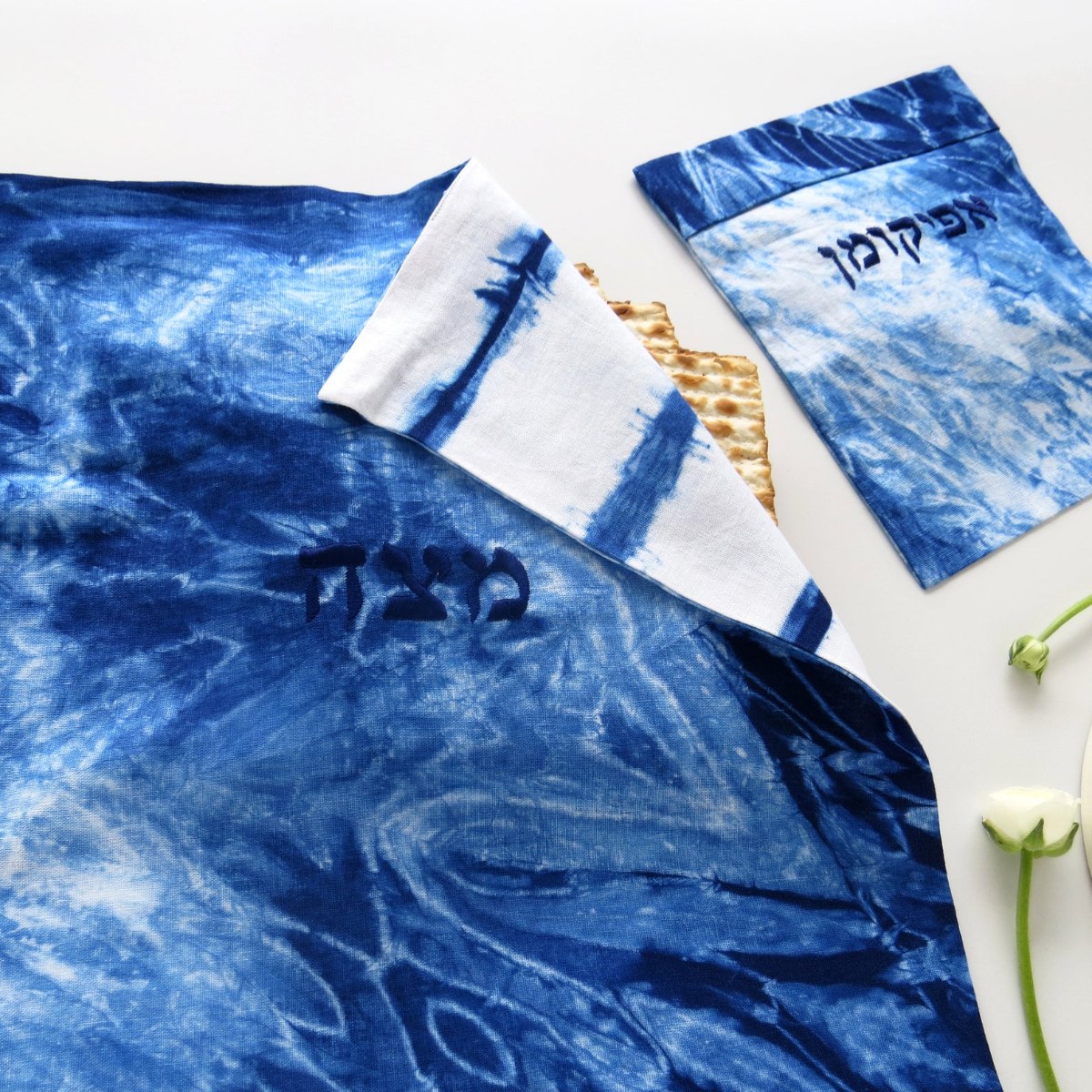 סט של כיסוי למצה ולאפיקומן בצביעת שיבורי ידנית ורקמה- כל סט יחיד ומיוחד!