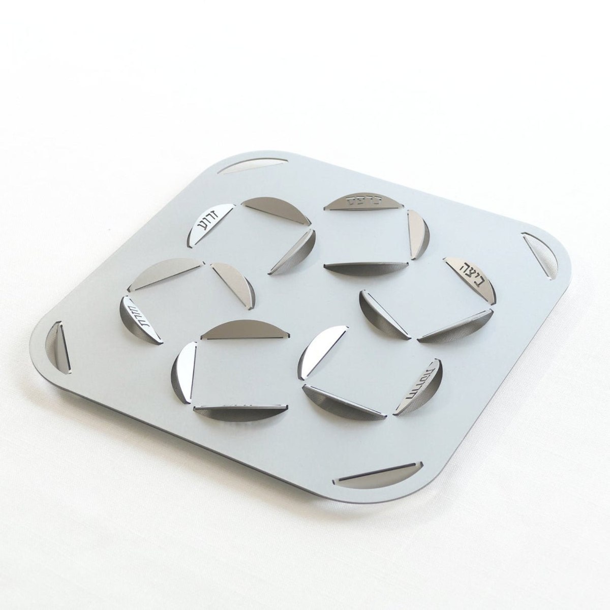 מגש המצות מעוצב בצורה בה הוא עומד בהטייה ייחודית, וניתן להשתמש בו בשני כיוונים- ישר והפוך.