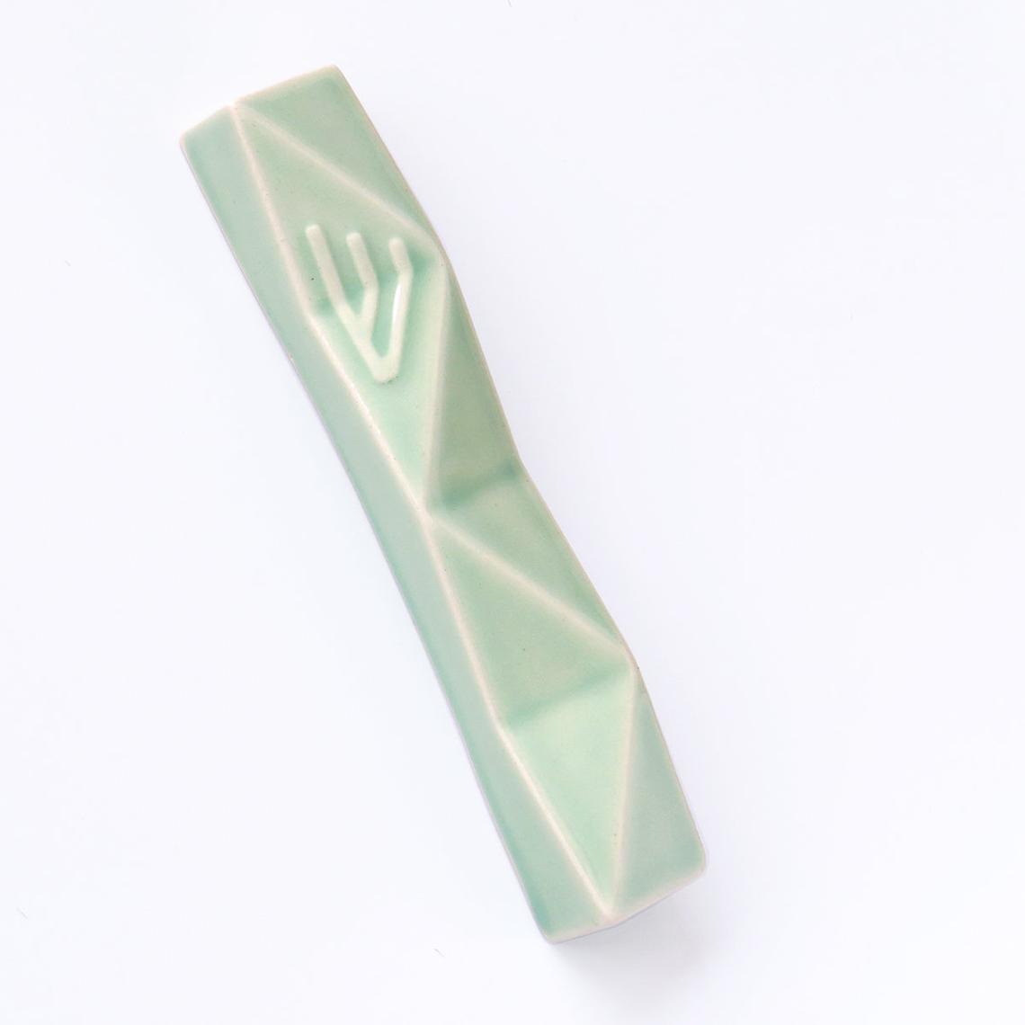 בית מזוזה ירקרק מקרמיקה בעיצוב מודרני בגימור גלזורה בגוון ירקרק עדין המזכיר מים, אגם או ים. בעיצוב המזוזה משתלבת ש' מובלטת , אמירה עיצובית עכשווית וגם מסורתית - כבר בכניסה לבית.
